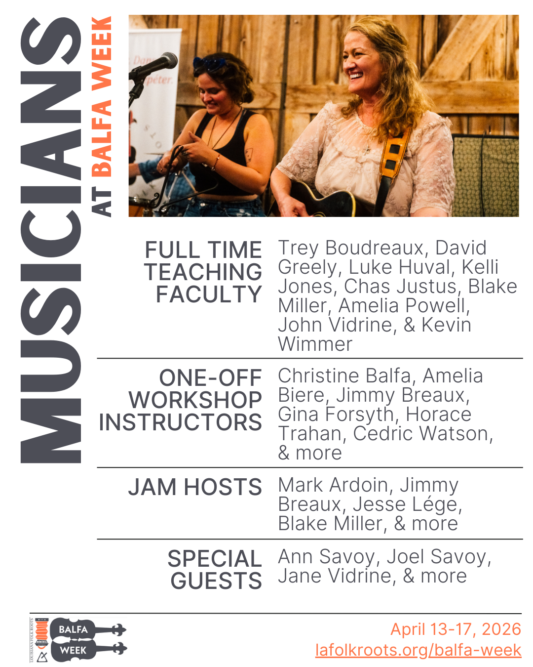Balfa Week faculty includes outstanding Cajun & Creole music, dance, Louisiana French language enthusiasts and folklife educators. Here is a sample of Balfa Week faculty: